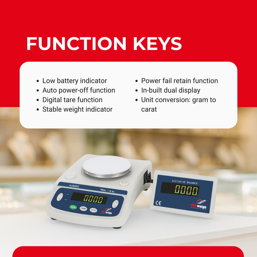 - Piece counting, tare, unit conversion, M+ and MR functions