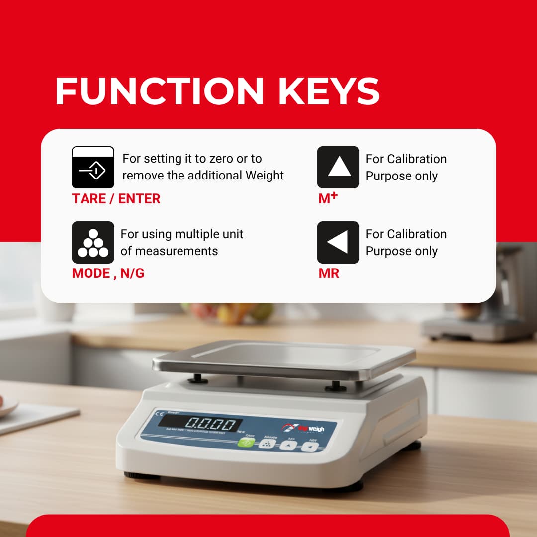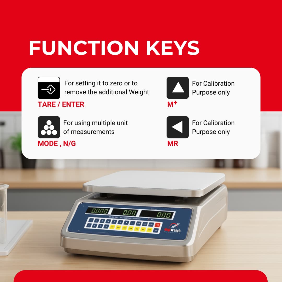 - Piece counting, tare, unit conversion, M+ and MR functions